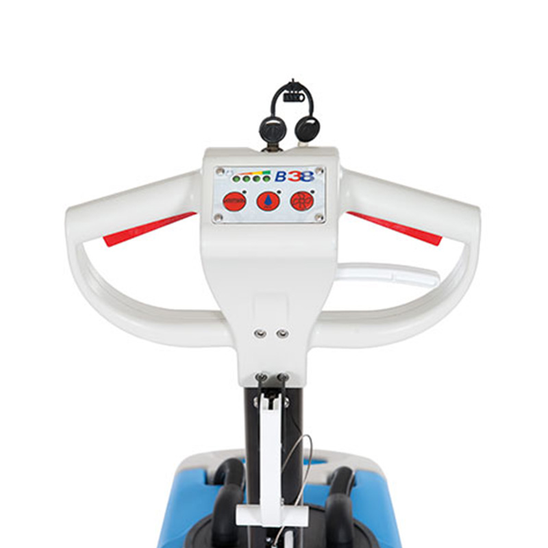 Model B 38 B został zaprojektowany tak, aby maksymalnie ułatwić pracę użytkownikowi. Wyposażony jest w bezobsługowe akumulatory pozwalające na pracę przez co najmniej jedną godzinę oraz wbudowaną ładowarkę. Regulowany uchwyt umożliwia wygodne dopasowanie maszyny do każdego operatora, a intuicyjne elementy sterujące znajdują się w łatwo dostępnych miejscach. Zbiornik na wodę brudną posiada duży otwór, co umożliwia jego łatwe czyszczenie i dezynfekcję. Wszystkie ustawienia można regulować bez użycia narzędzi, a urządzenie dokładnie osusza każdą powierzchnię, docierając do trudno dostępnych miejsc. Maszyna pracuje cicho, dzięki czemu może być stosowana w każdym środowisku.